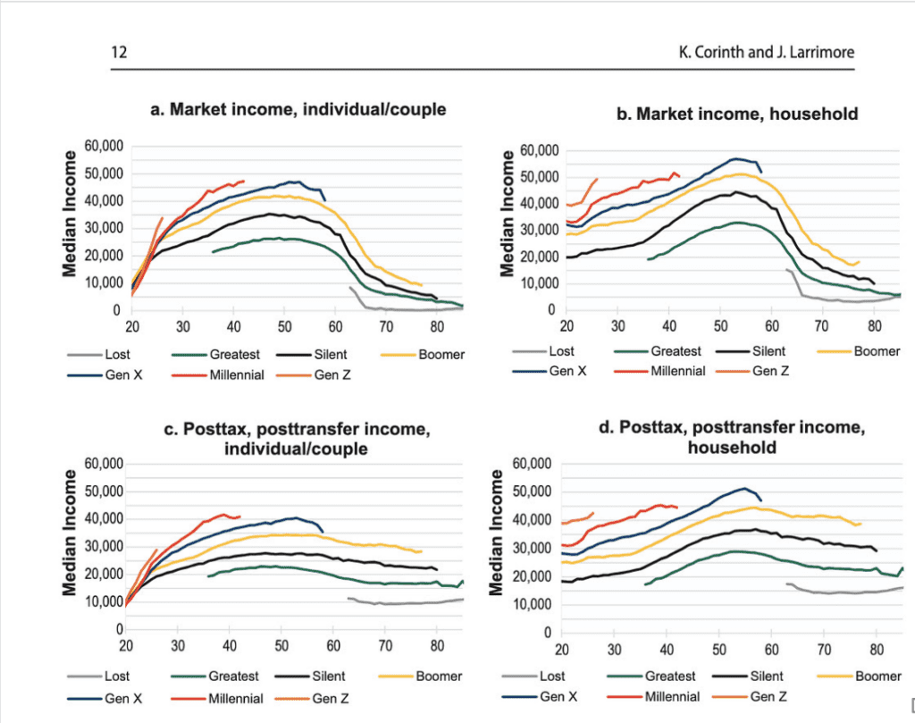 Young Americans suffer more troubled spirits these days than older generations. Gen Z is by far the most pessimistic and unhappy age cohort – a position historically held by adults in their 40s and 50s when responsibilities weigh heaviest. But for what it’s worth, Gen Z is actually doing pretty well financially. (And their biggest concerns are financial.) In fact, so far they are on their way to becoming the richest generation in American history. A new study in the journal Demography has found that Millennials at ages 36 to 40 have 20% higher real median household income than earlier generations at the same age. Gen Z hasn’t reached that age yet, but so far they are showing higher median incomes than Millennial counterparts at parallel ages.