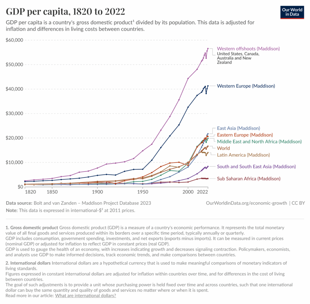 Affordability is a real issue these days. And everyone’s financial situation is unique. But every once in a while it’s useful to step way back and take a really long-lens at how far we’ve come. This two-century-plus chart shows how incomes have changed. It’s corrected for purchasing power by year and by country. Overall, income has risen fivefold per person, even while population has increased fivefold (so total income is 25 times higher.)